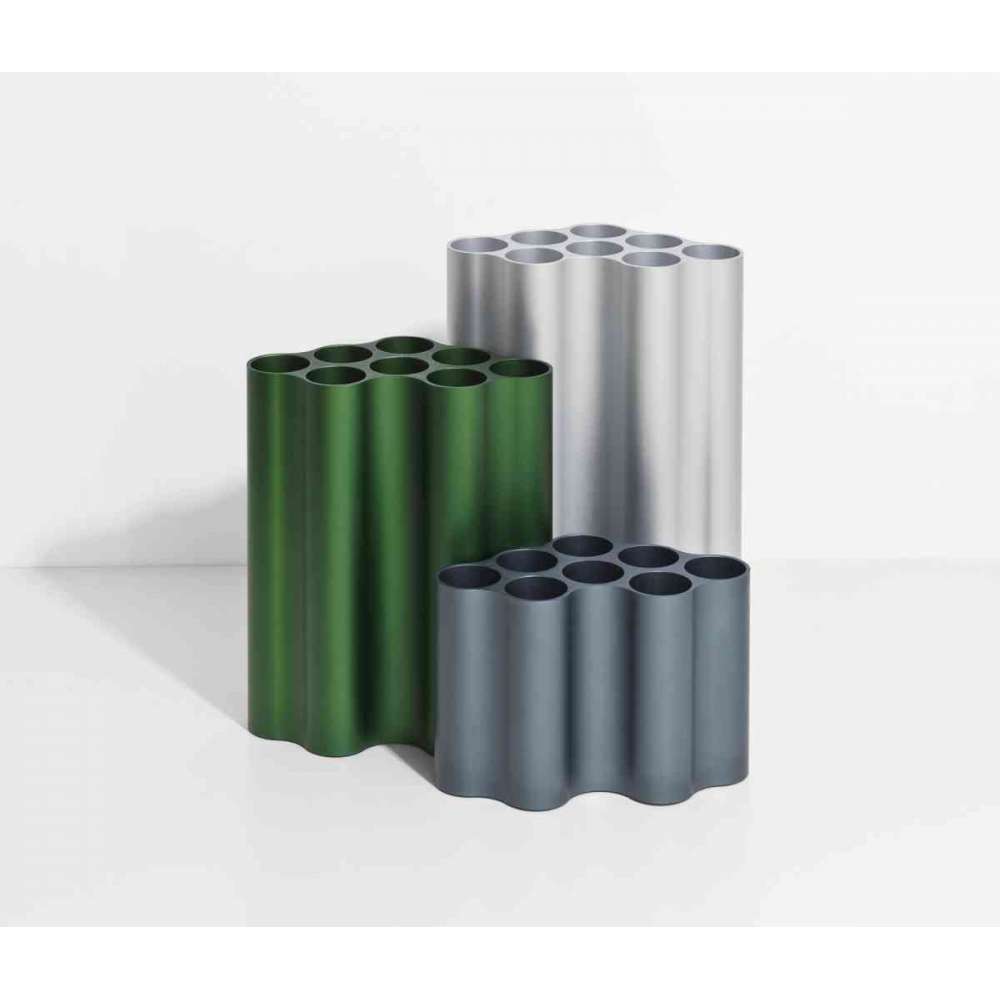W przypadku wazonu Nuage projektanci wykonali motyw chmury w wytłaczanych profilach aluminiowych o różnej długości. Wnęki w podstawowej formie są teraz ustawione pionowo, dzieląc wazon na osiem pojedynczych rurek, które można wykorzystać do pomysłowego ułożenia kwiatów i traw. Pofałdowane powierzchnie z anodowanym wykończeniem w różnych kolorach tworzą atrakcyjną grę światła i cienia. Dzięki precyzyjnym konturom zewnętrznym wazony można ze sobą łączyć, tworząc całe „formacje chmur”.