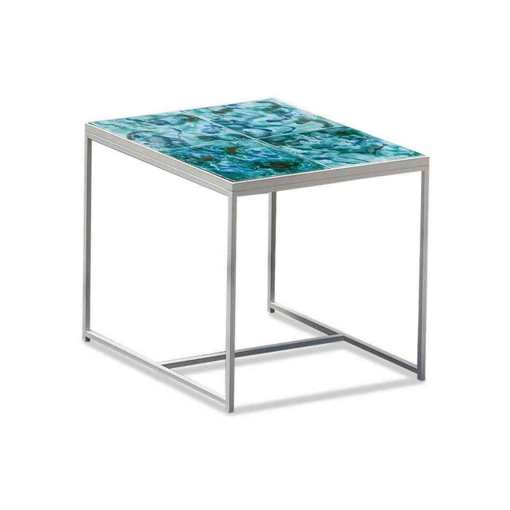 Stoły: malowana metalowa konstrukcja dostępna w kolorze białym, antracytowym lub rdzawym, z perforowanym metalowym blatem, płytki dostępne w różnych rozmiarach w romby lub kwadraty, motywy i kolory.