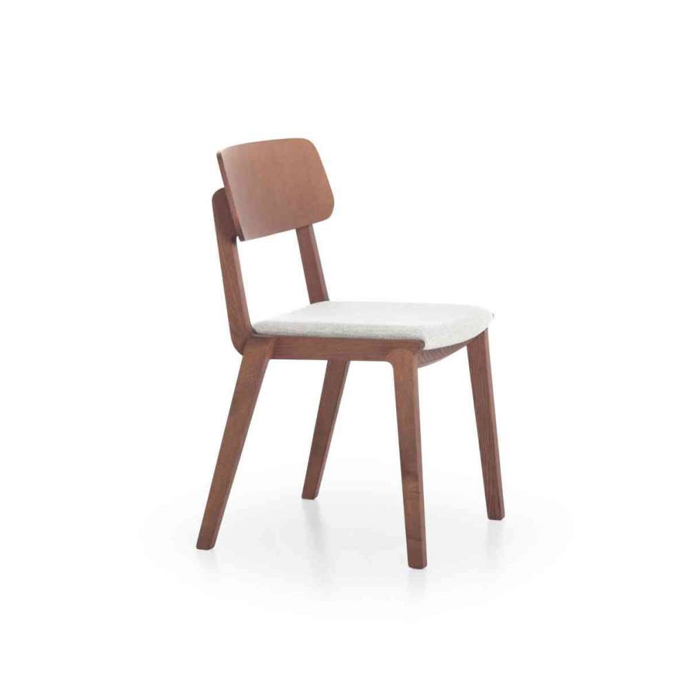 Krzesło do jadalni sztaplowane, z drewna jesionowego. Tapicerka z tkaniny, winylu lub skóry.