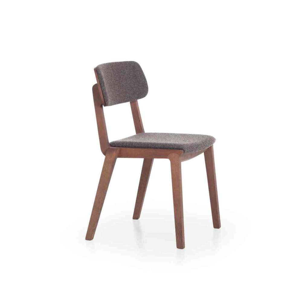Krzesło do jadalni sztaplowane, z drewna jesionowego. Tapicerka z tkaniny, winylu lub skóry.