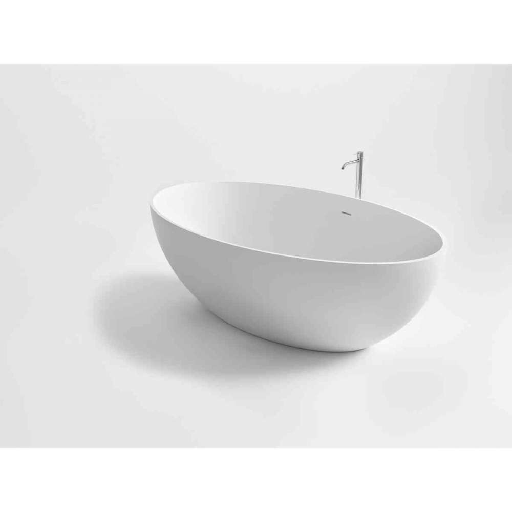Freistehende Badewanne mit matt-weißer (alternatywa: glänzend-weißer) Oberfläche, hergestellt aus VELVET STONE™. Handveredeltes Gussteil aus feinem Kalkstein und hochwertigen Harzen.