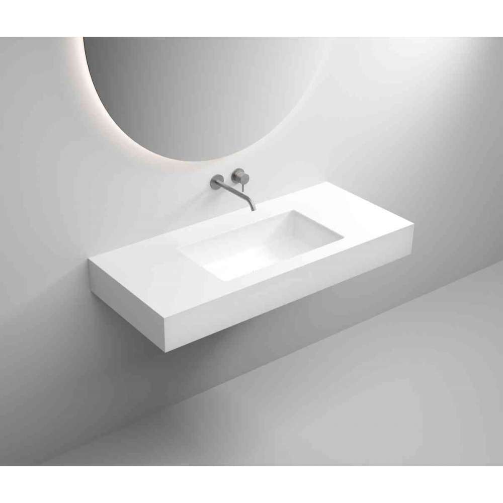 Umywalka pojedyncza na wymiar z matową białą powierzchnią do montażu ściennego, solid surface mineralny materiał VELVET STONE™(made in Italy). Różne wzory umywalek i możliwość personalizacji.