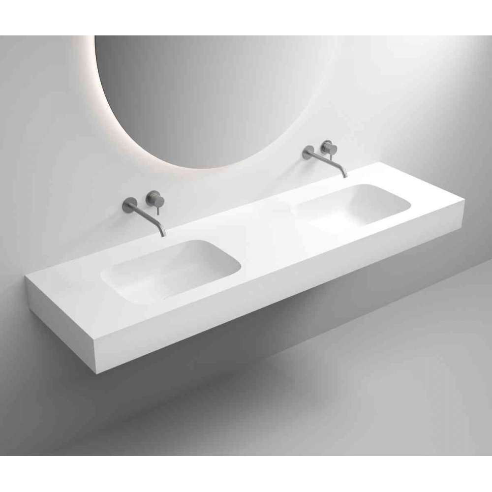Umywalka podwójna na wymiar z matową białą powierzchnią do montażu na ścianie, solid surface mineralny materiał VELVET STONE™(made in Italy). Różne wzory umywalek i możliwość personalizacji.