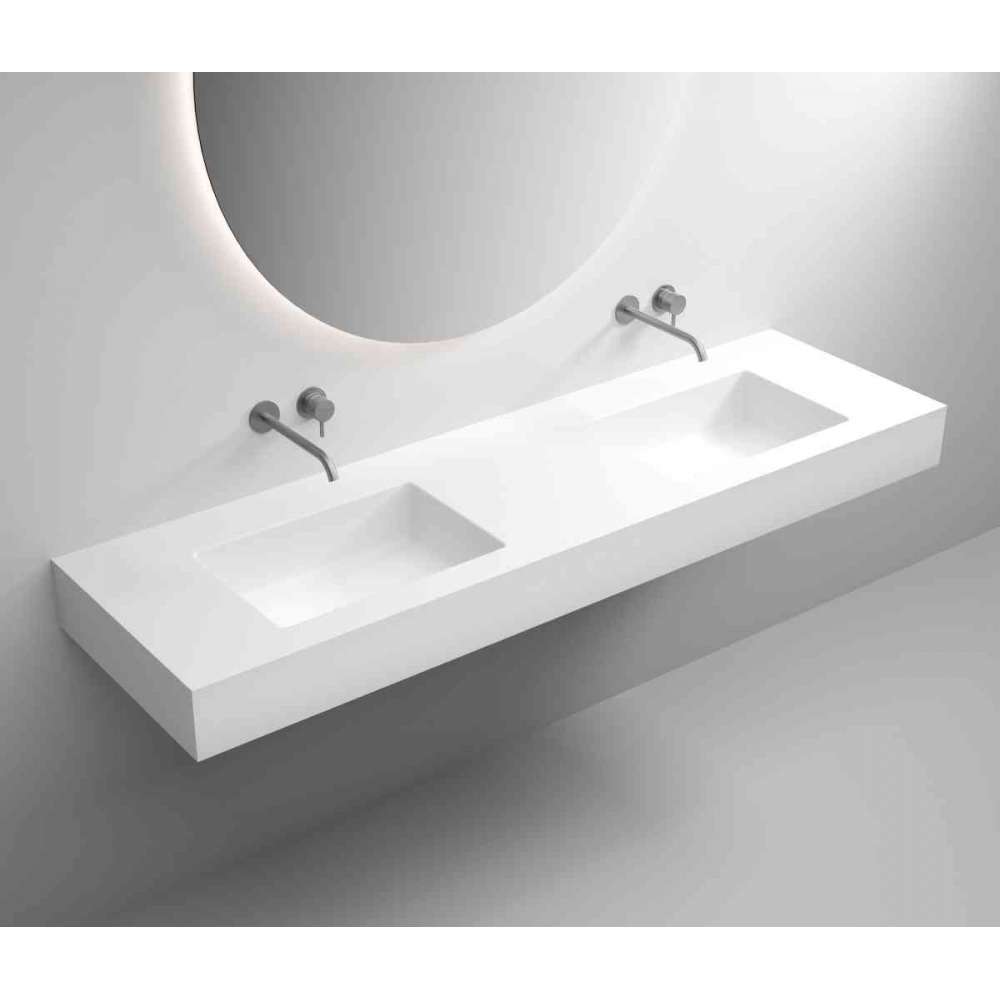 Umywalka podwójna na wymiar z matową białą powierzchnią do montażu na ścianie, solid surface mineralny materiał VELVET STONE™(made in Italy). Różne wzory umywalek i możliwość personalizacji.