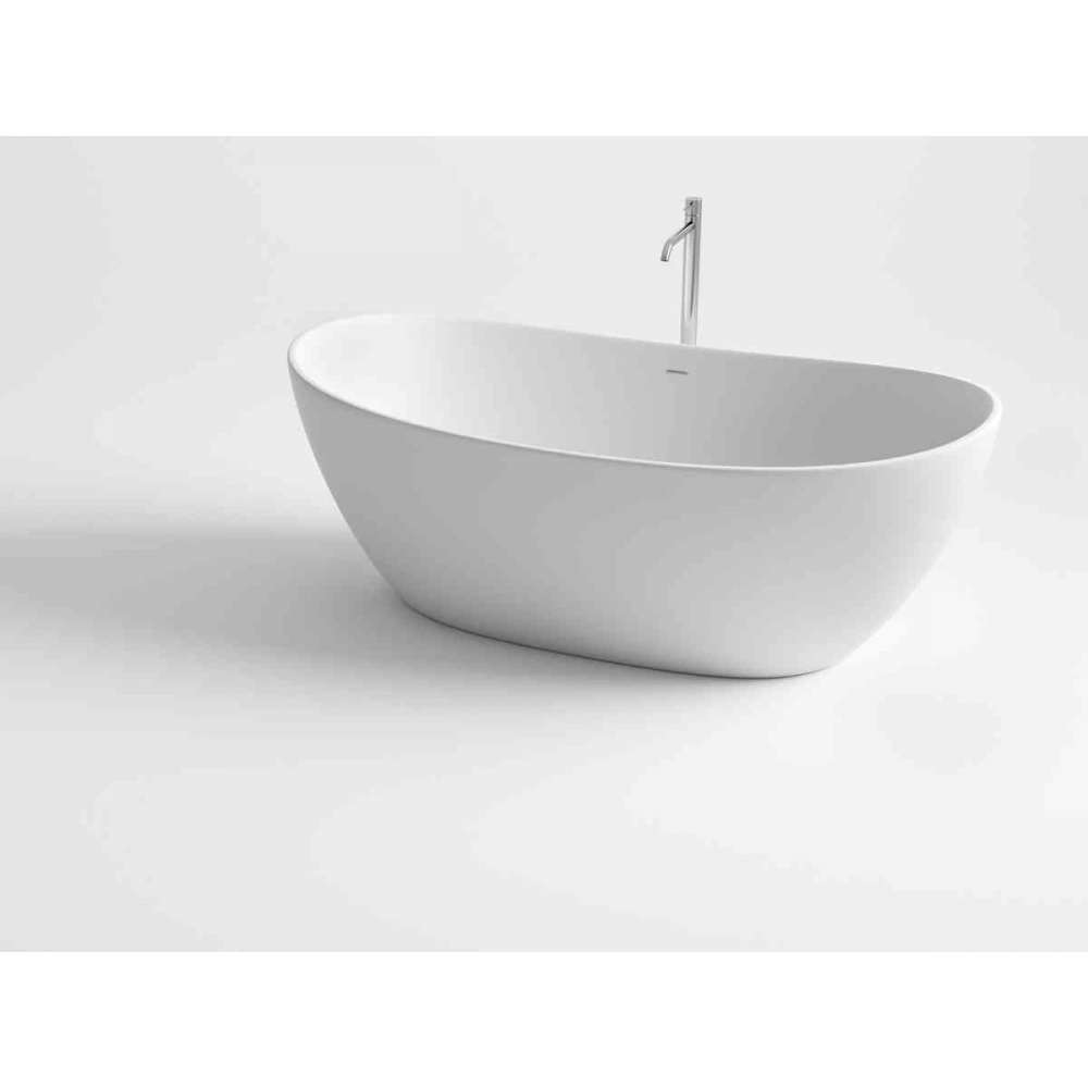 Freistehende Badewanne mit matt-weißer (alternatywa: glänzend-weißer) Oberfläche, hergestellt aus VELVET STONE™. Handveredeltes Gussteil aus feinem Kalkstein und hochwertigen Harzen.