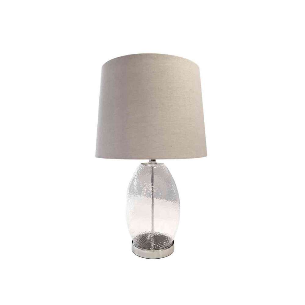 Pure to lampa stołowa, której unikalną cechą jest szorstka, przezroczysta szklana obudowa, która odbija światło dookoła. Posiada również szary lniany abażur o średnicy 32cm. Jest jedno gniazdo E27 (żarówka nie jest dołączona).