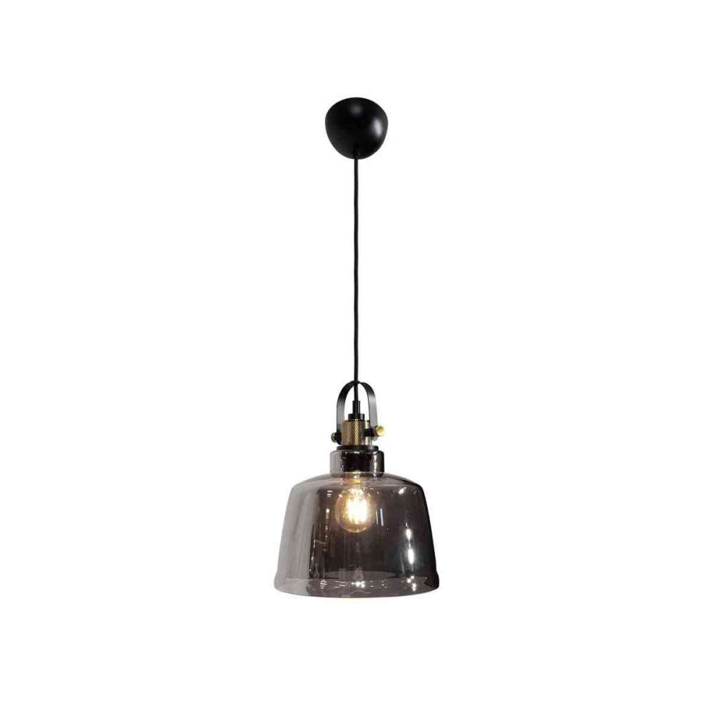 Średnica 22 cm, Wysokość 30 cm, 1 x E27 max 40 W, Przewód z czarnej tkaniny, Długość przewodu 3 m, Mocowanie na haku, Czarny / mosiądz / przydymione szkło