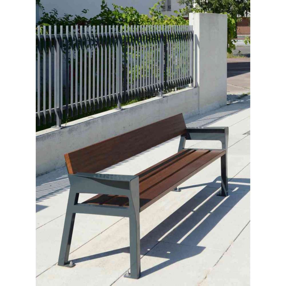 Rama nóg z rury stalowej 50 x 50, podłokietnik z blachy stalowej o grubości 6 mm. Siedzisko drewniane o przekroju 120 x 35 mm i oparcie o przekroju 200 x 35 mm. Uszczelnione w 4 punktach. Stal: cynkowanie, a następnie wypalane poliestrowe malowanie proszkowe. Drewno: Izolacja przez kąpiel, a następnie 2 warstwy bejcy.