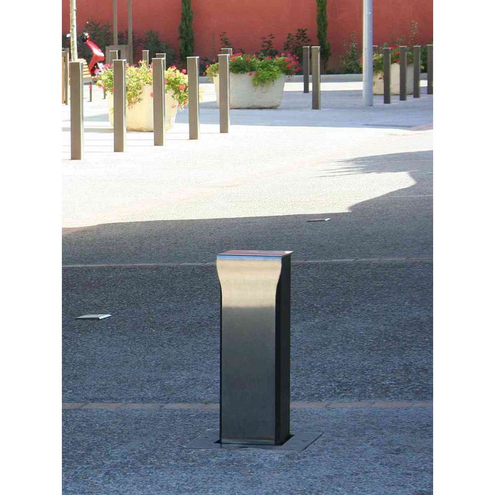 Malowana kwadratowa rura stalowa i korpus z blachy nierdzewnej o grubości 5 mm. Całkowicie wyjmowany system ze stali nierdzewnej, zamykany trójkątnym kluczem. W wersji wysuwanej system automatycznego resetowania sterowany kluczem trójkątnym. Stal: cynkowanie, a następnie wypalane poliestrowe malowanie proszkowe. Stal nierdzewna: szczotkowana. Pasek kontrastowy PRM. Wtyczka do systemu wyjmowanego 80, 110 i 170