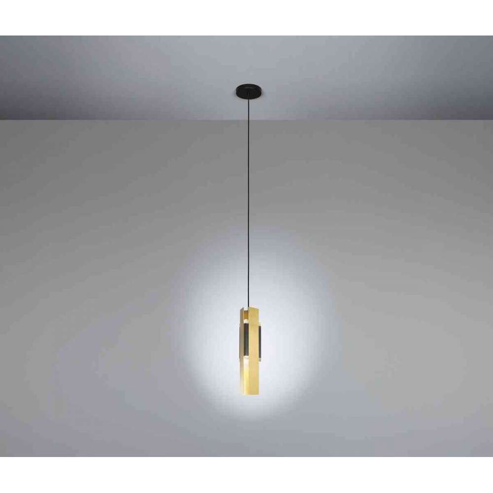 Lekko inspirowana Deco lampa wisząca z trójkątną podstawą. Główny korpus jest pokryty czarną powłoką, a światło jest rozprowadzane przez 2 akrylowe pryzmaty i jest owinięte w 3 prostokątne folie ze szczotkowanego mosiądzu. Można go użyć pojedynczo lub zgrupować, aby stworzyć żyrandol.