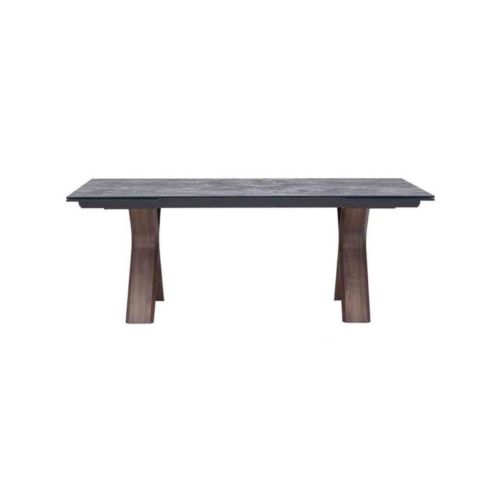 Stały lub rozkładany stół z drewnianą podstawą giętą termicznie, przeznaczony do łączenia z eleganckimi blatami ze szkła lub kamionki porcelanowej. 100 wys. 75 cm