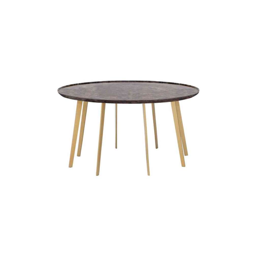 Kompozycja stolików bocznych i stolika kawowego wykonanych z najcenniejszych marmurów, które tworzą wydrążone blaty jak tace, z podstawą lakierowaną w kolorze matowego złota.
