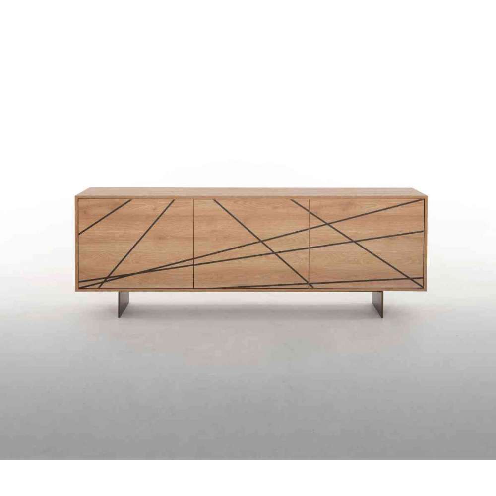 Najlepsze drewno, wykończone orzechem Canaletto lub jasnym dębem, zyskuje dodatkowy luksus dzięki iluzji reliefu swoich linii. Kolory i faktura tworzą kontrast łączący prostotę i elegancję. Dwu- lub trzydrzwiowy kredens wsparty na solidnej metalowej podstawie w kolorze kamiennego brązu. Niezbędny. Po prostu.