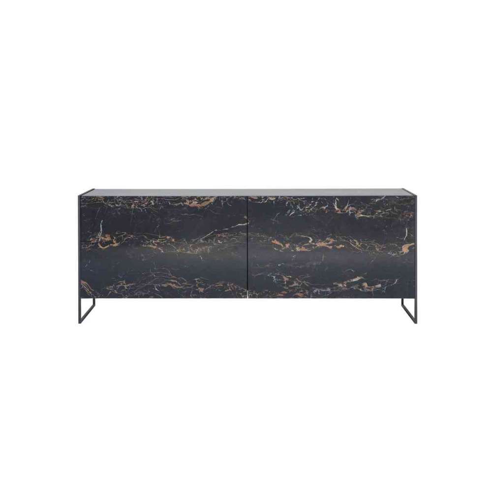 Kredens z komplanarnymi drzwiami z gresu porcelanowego i strukturą z lakierowanego metalu.