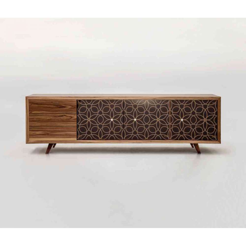 Kredens 3 drzwi i 3 szuflady z orzecha canaletto i trawionego brązowego szkła z sitodrukiem.