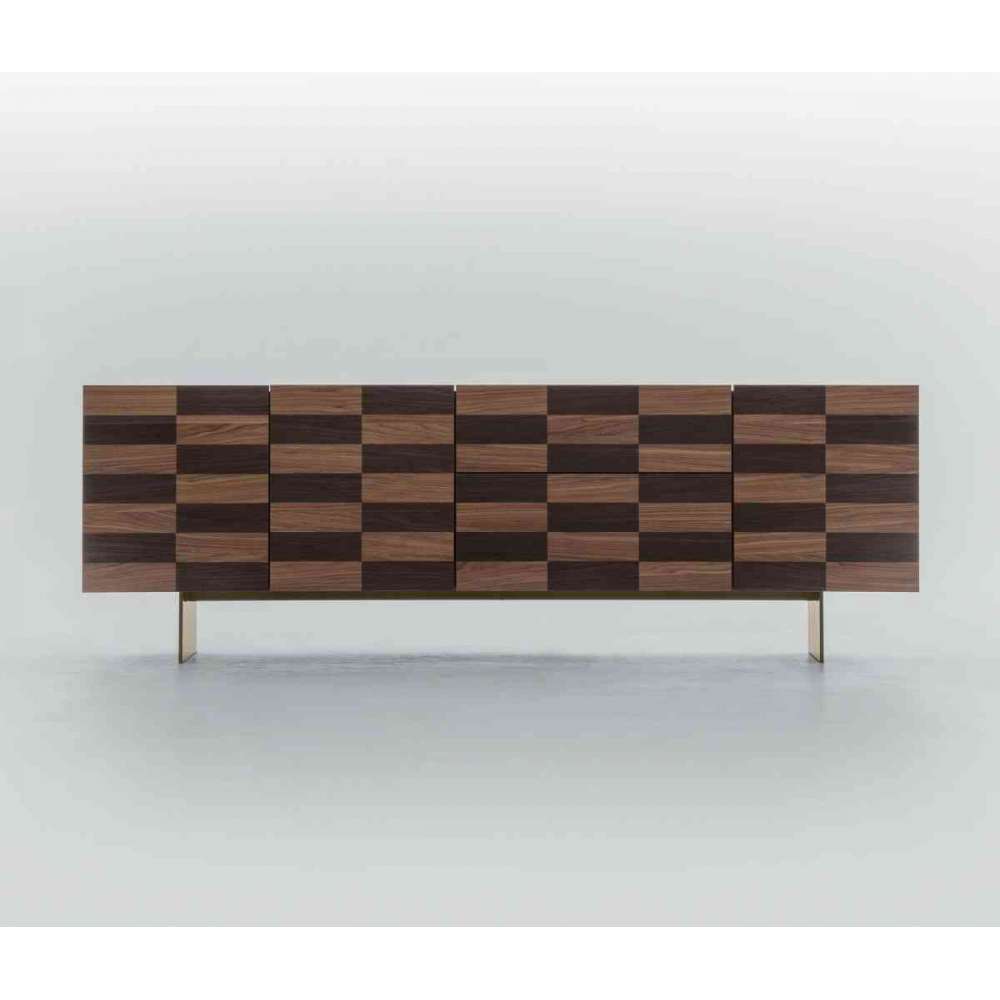 To jest drewniany kredens, misternie zdobiony laserową intarsją. Konstrukcja Colosseo jest wykonana z orzecha włoskiego Canaletto i ma bardziej nowoczesną, smukłą metalową podstawę z kamienia i brązu. Dostępnych jest więcej wersji i rozmiarów: dwie środkowe szuflady i drzwiczki po bokach