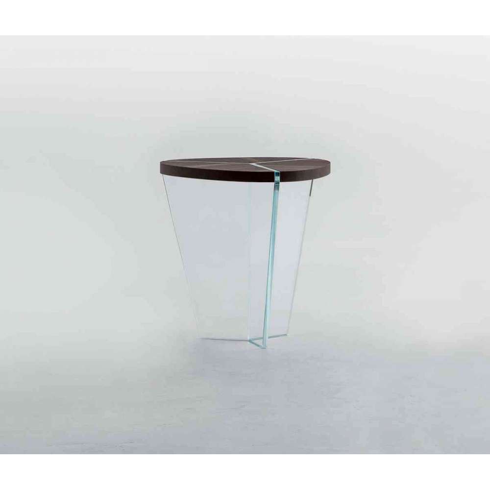Spójrz na to z góry, a zobaczysz delikatny rysunek: trzy linie przesuwające się od środka do boków. Drewno doskonale wtapia się w szklaną podstawę. Po raz kolejny okazuje się, że techniczna precyzja ma fundamentalne znaczenie dla estetyki. Słoje drewna, cierpliwie uporządkowane, aby zrównoważyć znikające punkty szkła, uzupełniają Aidę, hołd złożony zarówno włoskiej kulturze, jak i materiałom. .