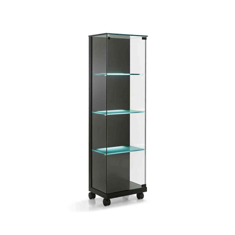 Witryna ze szkła i drewna, dostępna w kolorze drewna wiśniowego, matowego czarnego lakieru, wengè lub bielonego dębu. Matowe szkło.