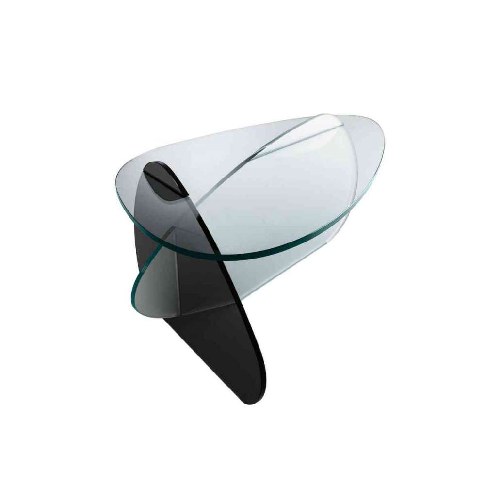 Trzy szklane tafle, które optycznie wydają się krzyżować, tworzą ten niski stolik wykonany z trzech różnych rodzajów szkła: dymionego, matowego i przezroczystego. cm