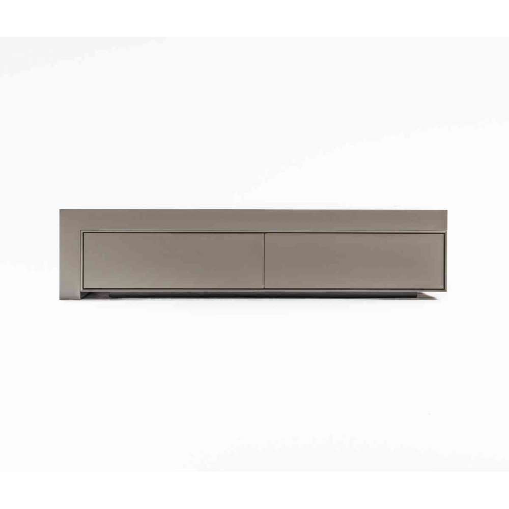 Ten stół może być również używany jako kredens lub szafka, oprócz stołu środkowego. W przypadku montażu wzdłuż ściany jego szerokość można elastycznie zmieniać, przesuwając blat w zależności od wielkości ściany. Dlatego może idealnie wpasować się między ściany, o ile szerokość ściany mieści się w określonych granicach. Może służyć również jako szafka RTV. Całkowitą szerokość można regulować w zależności od rozmiaru telewizora, co zapewnia idealne dopasowanie. Część szafkowa została wykonana zgodnie ze specyfikacją szafki Composition i posiada delikatne, cienko ścięte końce. Neutralne kolory wykończone lustrem (ciepła biel i szarość) dodatkowo zapewniają poczucie jedności ogólnego kształtu, jednocześnie tworząc wrażenie miękkości w przestrzeni, gdy jest przesuwany.