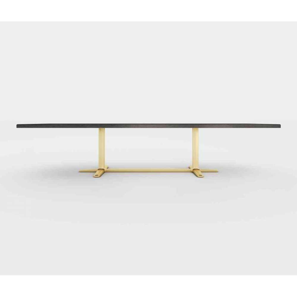 Mosiężne odlewane nogi Takaoka składają się z czterech odlewanych części, w tym wspornika, potrójnych końcówek nóg, poprzeczek, które stykają się z podłogą i łączą lewą i prawą nogę oraz wspornik łączący blat z nogami. Rzemieślnicy wypełniają metalowe pudełko specjalnym piaskiem, który łatwo krzepnie. Gęstość piasku zależy od doświadczenia, ponieważ bardzo dokładne, precyzyjne produkty nie mogą być wykonane bez idealnej gęstości i twardości. Nawet podczas wlewania stopionego metalu do formy piaskowej zjawisko odkształcania metalu zwane wyciąganiem występuje, jeśli metal nie zostanie umieszczony w odpowiedniej sekcji otworu do odlewania. W ten sposób metal nie może dotrzeć do każdego rogu formy piaskowej. Rzemieślnicy muszą również znać właściwości metali i różnice w ciężarze właściwym mosiądzu, miedzi, aluminium i żelaza, co wymaga doświadczenia we wszystkich dziedzinach. Nogi Takaoki mają grubsze wsporniki, które podtrzymują gruby, ciężki blat z litego drewna. Również tył drewnianego blatu ma zakrzywione rowki, a elementy łączące nogi z drewnianym blatem są wykonane z mosiądzu, aby zapobiec wypaczaniu się blatu przy precyzyjnym ustawieniu. Końcówki nóg wystają w trzech kierunkach, aby podeprzeć stół w sześciu kierunkach, zapewniając dodatkową stabilność. Krawędzie mosiężnych nóg są sfazowane, aby dodać okrągłości każdej powierzchni czworobocznych nóg, dzięki czemu miękki wygląd współistnieje z japońskimi elementami. Małe powierzchnie grubego blatu z litego drewna są również fazowane, aby dodać detali, które łączą konstrukcję nóg. Odbarwienia i korozja mosiądzu, wraz ze starzeniem się drewnianego blatu, wskazują na upływ czasu. Synchronizują się ze sobą, aby stemplować czas na stole. Zaprojektowaliśmy ten stół z myślą o pięknym wyglądzie przekazywanym kolejnym pokoleniom przez dziesięciolecia i nadchodzące stulecie.