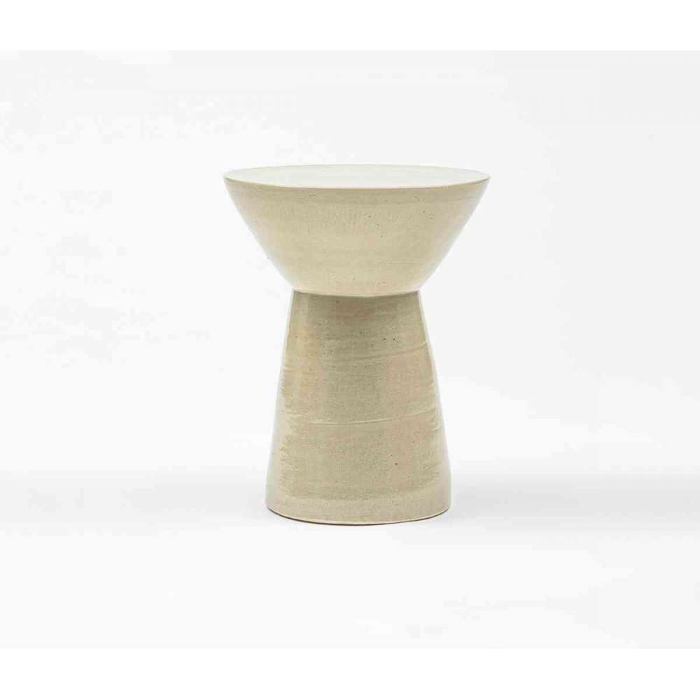 Rzeźba z kamionki to realizacja pielęgnowanego od dawna pragnienia wykonywania mebli z ceramiki. Stoliki boczne są wykonane z półporcelany, twardej ceramiki pomiędzy porcelaną a ceramiką, i są tworzone i komercjalizowane od 2015 roku przez Shimada Gama ceramiki. Shimada Gama to ceramika Iwami Yaki wykonana z gliny regionu Iwami w zachodniej prefekturze Shimane. Glina z tego regionu jest bardzo twarda i zawiera mniej żelaza, podobnie jak kamionka produkowana w Wielkiej Brytanii. Meble nazwano rzeźbą z kamionki, ponieważ tylko rzemieślnik wykonuje wszystkie procesy od przygotowania gliny, przez toczenie rzeźby na kole garncarskim i wykonanie glazury do kalcynacji w piecu wspinaczkowym. Duże ceramiczne meble są twarde i ciężkie i wymagają siły fizycznej i umiejętności wspieranych przez siłę woli i pasję, dumę z pracy i szacunek dla współpracowników. dachówki i dzbany na wodę były kiedyś produkowane i dystrybuowane w całej Japonii. Glina z tego regionu jest odporna na sól, wilgoć i zatrzymuje powietrze, dlatego nadaje się do dachówek, słojów na wodę i marynat. Obszar Gotsu był niegdyś dobrze prosperującym głównym okręgiem przemysłowym ceramiki z wieloma garncarzami. Jednak wraz ze zmianą czasów produkty chemiczne i wyroby metalowe rozprzestrzeniły się po całym kraju. Obecnie dachówki Sekishu Gawara i naczynia Iwami Yaki powstają w zaledwie kilku garncarzach. Naczynia Iwami Yaki to twarda półporcelanowa kalcynacja w intensywnym ogniu od 1200 do 1300 stopni Celsjusza, dlatego nadaje się do dużych słojów na wodę. Wyroby są wykonane techniką unikalną dla Iwami Yaki, w której rzemieślnik rozciąga glinę shino-zukuri lub tama-zukuri w paski i układa je w stosy w okrąg, a następnie używa całego ciała do kształtowania formy, obracając koło garncarskie. Ta technika wymaga znacznej siły i doświadczenia, aby uformować kawałek bez wahania i zatrzymywania się. Na powierzchni tego prostego pojemnika widniały maleńkie wzorki, a szkliwo było przezroczyste z nutą bladozielonej. Ta prosta, skromna obecność zdawała się reprezentować charaktery garncarza i okolicy. Jasnozielona doniczka z szalonymi wzorami była tak niezapomniana, że szukaliśmy ceramiki, aw 2015 roku odwiedziliśmy ceramikę Shimada Gama w Gotsu City w prefekturze Shimane. Gotsu znajduje się około trzech godzin jazdy samochodem od Izumo City w tej samej prefekturze. Znajduje się nad Morzem Japońskim, ale ma łagodny, prawie tropikalny klimat z zachowanym i bogatym środowiskiem naturalnym. Prefektura Shimane ma słynne garncarstwo w Izumo i gdzie Bernard Leach często odwiedzał ruch folklorystyczny. Nawet teraz wiele garncarzy i producentów należy do tego ruchu. Przyciągnięci prostotą jego odwiecznego, rdzennego klimatu, wykorzystaliśmy umiejętności techniczne do stworzenia dużego słoja i wykorzystaliśmy twardość gliny do produkcji. Tak więc rzeźba kamionkowa narodziła się jako nieuchronna konsekwencja.