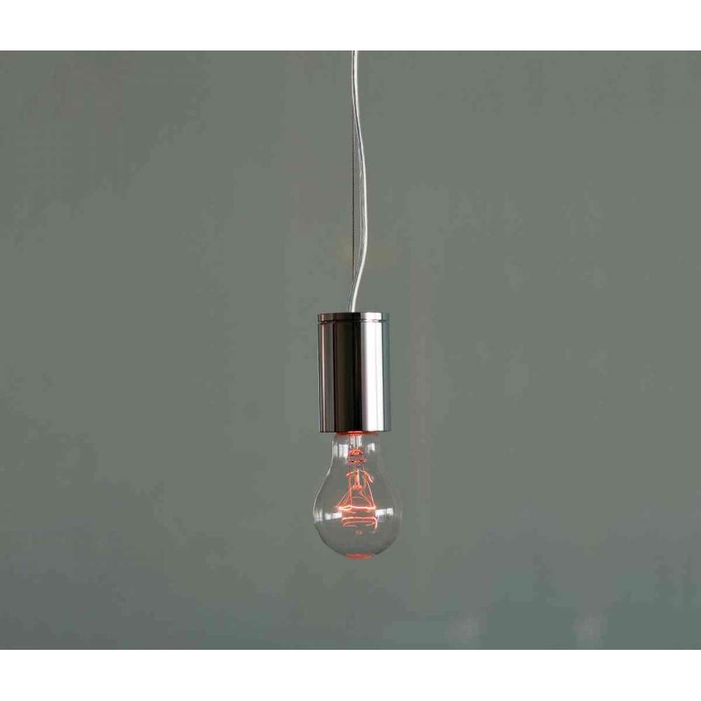 Piękno żarnika i mlecznobiała ciepła temperatura barwowa żarówki są zauważalnie atrakcyjne oprócz ich funkcji oświetlenia. Przyjemny dla oka jest również kształt szklanej bańki, która zakrywa żarnik. Cienkie szkło przypominające kroplę wody zostało wykonane w przeszłości przez rzemieślników ze szkła. Usuwając klosz oraz eliminując zbędne dodatki i dekoracje, stworzyliśmy prostą oprawę wiszącą na żarówki uniwersalne o ujednoliconej formie z żarówką, która emituje światło przez delikatne i cienkie szkło. Cylinder wyposażony w gniazdo jest wykończony chromowaniem, aby nadać mu czysty wygląd. Lampa wisząca nie jest podtrzymywana przez kabel elektryczny, ale przez cienki drut, który jest zawieszony na osłonie w kształcie walca przymocowanej do sufitu. Ten projekt tworzy napiętą atmosferę produktu. Jest to oprawa wisząca, która ostatecznie dąży do prostoty, która może stworzyć ciągłość pięknego światła, ustawiając kilka z nich w linii lub spokojną i pogodną atmosferę przy użyciu tylko jednego.
