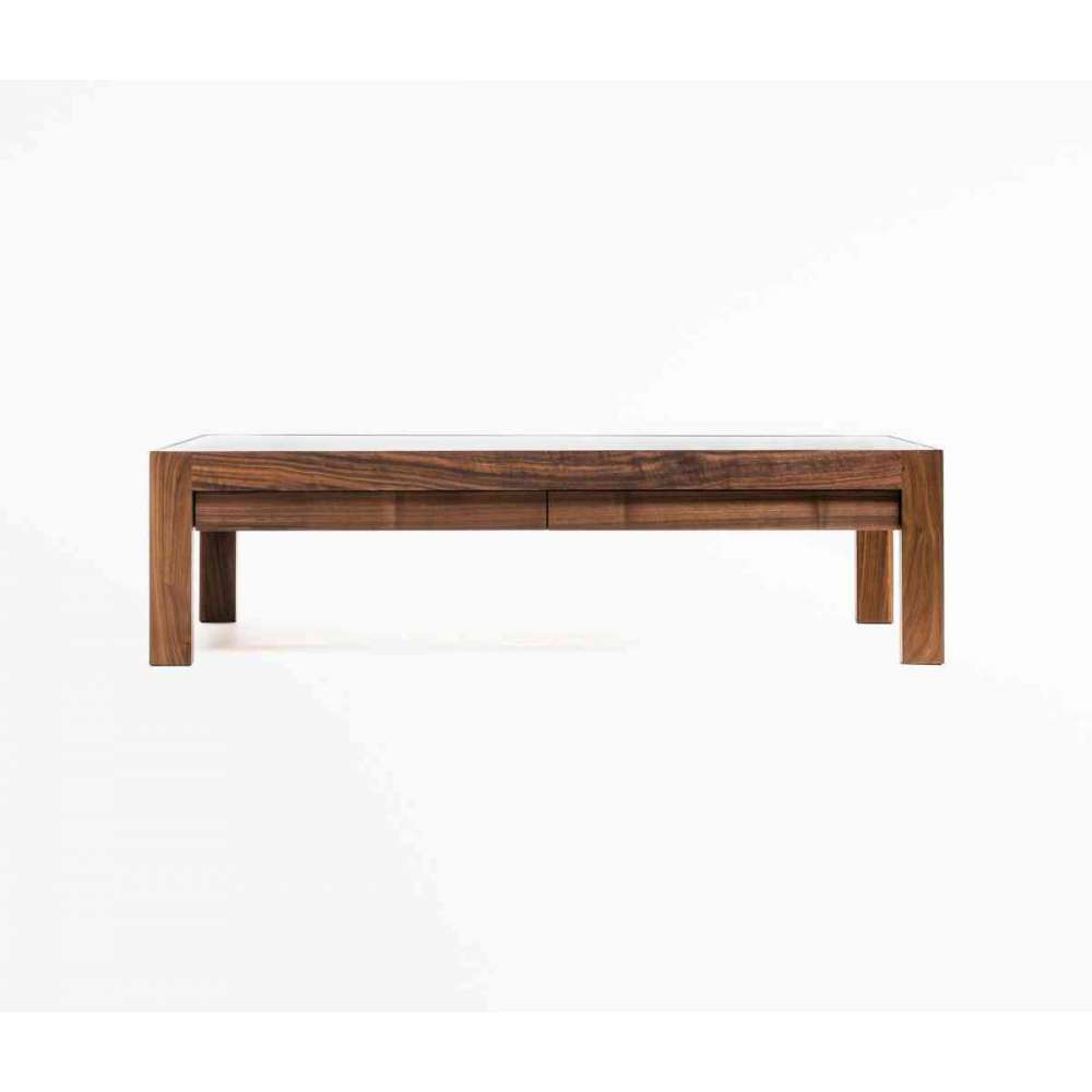 Ten stół do jadalni ma dokładnie sześcienny kształt. Nogi sięgają pionowo do blatu, tworząc ramę blatu. Szczeble łączące nogi tworzą jednocześnie ramę blatu bardzo prostego stołu. Rama blatu, otoczona nogami i szczebelkami z litego drewna, zapewnia efekt obramowania, który usztywnia cały stół. Ponieważ blat przeznaczony jest do umieszczenia w ramie, szklanemu blatowi nadano wyraz przypominający jezioro na ziemi. Oprócz szklanego blatu dostępny jest również drewniany blat z dołączonym grubym drewnianym fornirem. Ponadto seria poziomych stołów obejmuje różnej wielkości stoły do jadalni, a także niskie stoły. Niskie stoliki zostały zaprojektowane z szufladami, aby zapewnić funkcjonalność przy zachowaniu prostej konstrukcji. Ten sześcienny stół ma najprostszą formę, ale najlepiej wyraża filozofię Time & Style. Dzięki kompozycji prostej formy i materiałów, stół może służyć latami, nie nudząc się, zmieniając swój wyraz w różnych sytuacjach. Ponieważ grubość nóg i blatu oraz kompatybilność z krzesłami stają się ważniejsze, gdy stół ma prostszą formę, najwięcej uwagi poświęciliśmy wymiarom części i ich równowadze. Dobra równowaga ma duży wpływ na wygląd produktu, zwłaszcza gdy ma on prosty design. Prosta tabela zawiera ważne szczegóły i są to bardzo istotne czynniki.