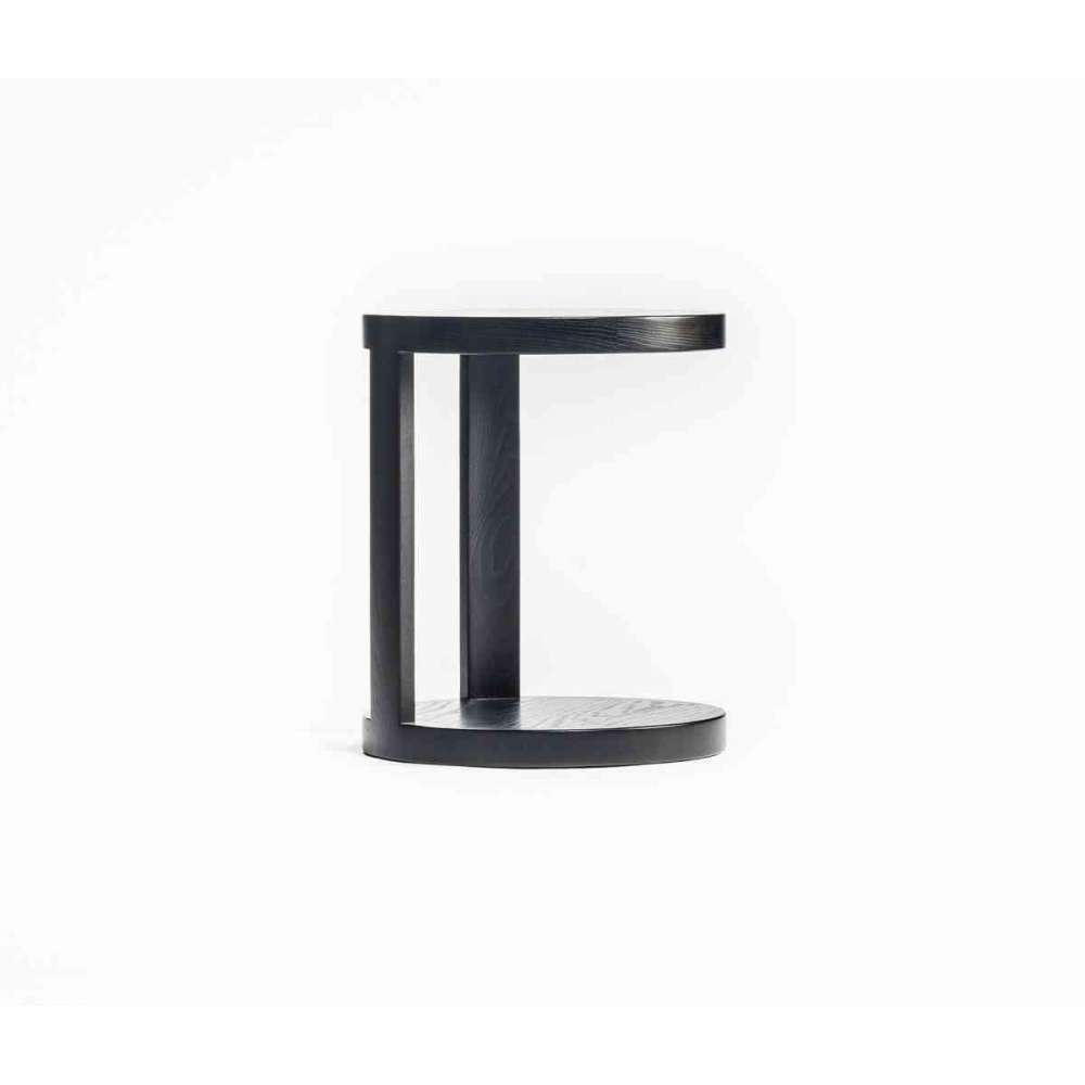 „Kruchość” nie jest słowem, którego należy używać w odniesieniu do mebli. Ten stolik boczny został zaprojektowany tak, aby można go było ustawić obok sofy lub umieścić nad siedziskiem sofy. Ma wspornikową konstrukcję, utworzoną z blatu, dolnej płyty i dwóch pionowych rozpórek drobno wygolonych w okrągłe łuki. Zaokrąglona rama z litego drewna, blat i płyta dolna wycięte są z kawałków naturalnego drewna.