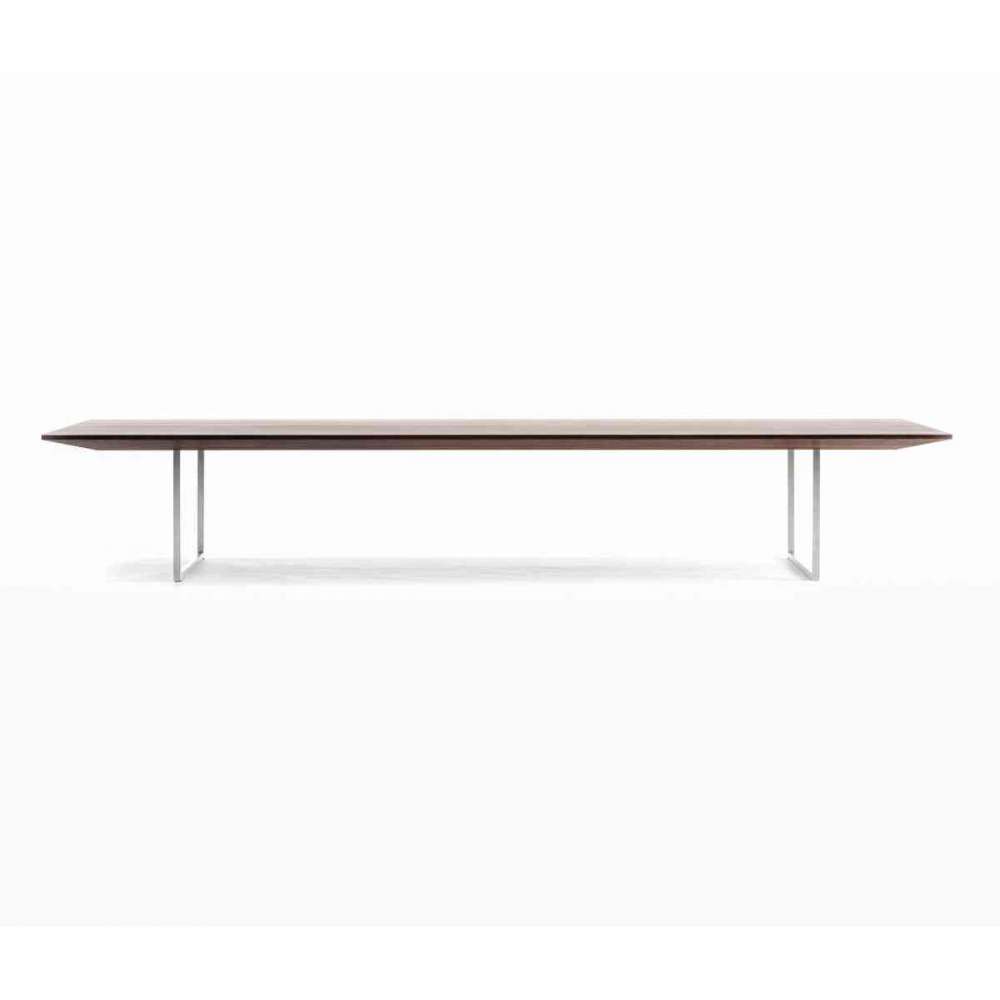Ten stół ma smukłe nogi, jakby cienka deska unosiła się w powietrzu. Solidne metalowe nogi są umieszczone wewnątrz blatu, dzięki czemu nogi są niewidoczne. Zwykle przy projektowaniu drewnianej płyty górnej i metalowych nóg, górna płyta jest umieszczana na górze nóg i mocowana śrubami. Ponieważ niewiele osób patrzy na tylną stronę górnej płyty, większość projektantów nie przejmuje się takimi szczegółami. W przypadku tego stołu rowki są wykonane w tylnej części górnej płyty, aby wszczepić metalowe ramy nóg w celu uzyskania płaskiej powierzchni. Chociaż stół ma system opuszczania, wyeliminowaliśmy wgłębienia nawet w niewidocznych częściach, aby stworzyć poczucie jedności między delikatnymi nogami a blatem z wrażeniem unoszenia się. Ludzie dotykają mebli rękami i ciałem. Uważamy, że należy zwracać szczególną uwagę na te niewidoczne małe części.