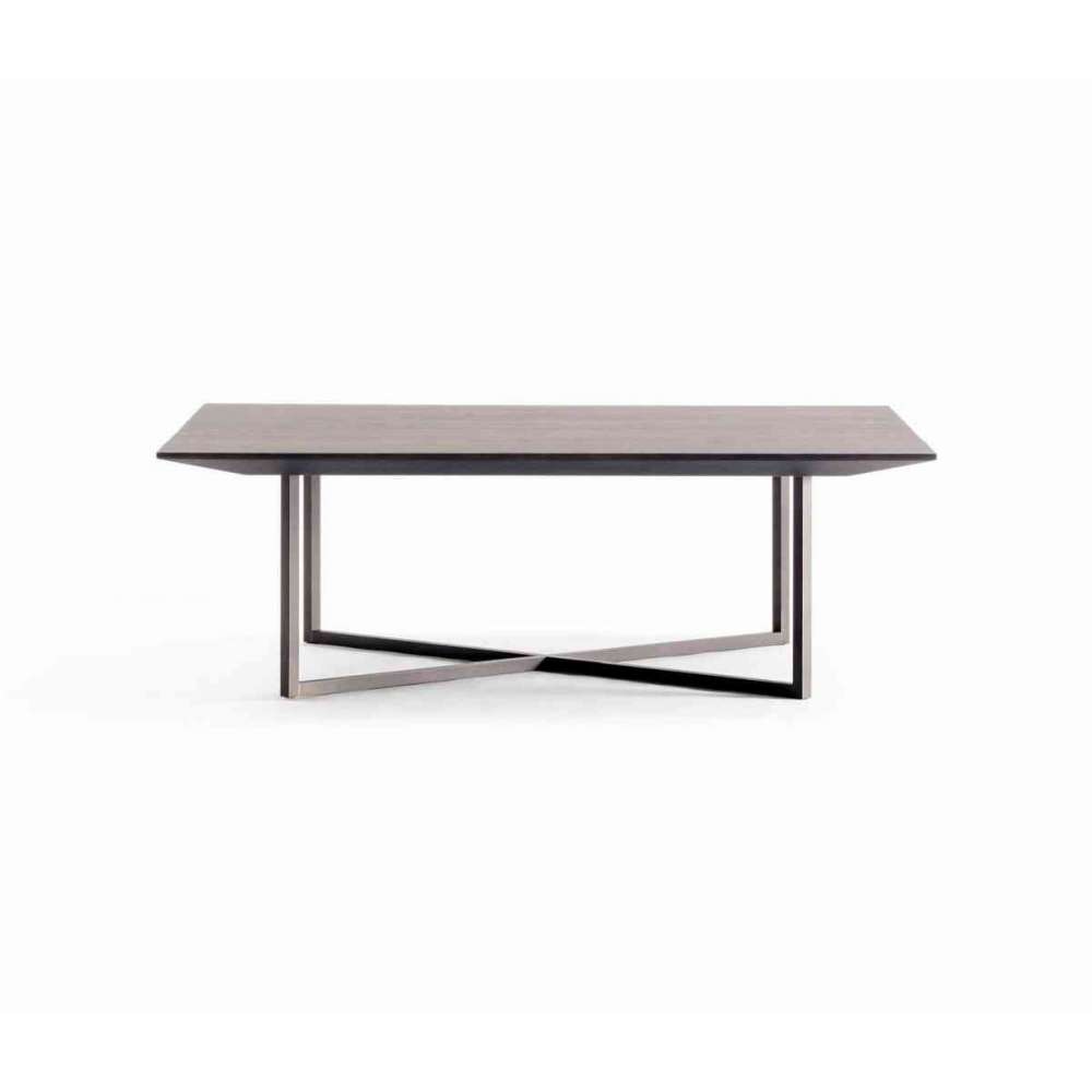 Ten stół ma smukłe nogi, jakby cienka deska unosiła się w powietrzu. Solidne metalowe nogi są umieszczone wewnątrz blatu, dzięki czemu nogi są niewidoczne. Zwykle przy projektowaniu drewnianej płyty górnej i metalowych nóg, górna płyta jest umieszczana na górze nóg i mocowana śrubami. Ponieważ niewiele osób patrzy na tylną stronę górnej płyty, większość projektantów nie przejmuje się takimi szczegółami. W przypadku tego stołu rowki są wykonane w tylnej części górnej płyty, aby wszczepić metalowe ramy nóg w celu uzyskania płaskiej powierzchni. Chociaż stół ma system opuszczania, wyeliminowaliśmy wgłębienia nawet w niewidocznych częściach, aby stworzyć poczucie jedności między delikatnymi nogami a blatem z wrażeniem unoszenia się. Ludzie dotykają mebli rękami i ciałem. Uważamy, że należy zwracać szczególną uwagę na te niewidoczne małe części.