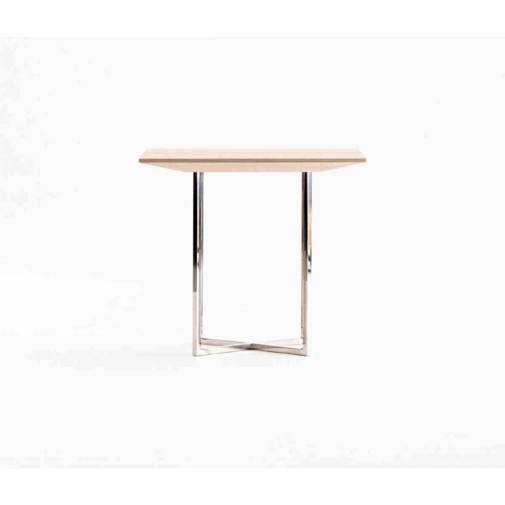 Ten stół ma smukłe nogi, jakby cienka deska unosiła się w powietrzu. Solidne metalowe nogi są umieszczone wewnątrz blatu, dzięki czemu nogi są niewidoczne. Zwykle przy projektowaniu drewnianej płyty górnej i metalowych nóg, górna płyta jest umieszczana na górze nóg i mocowana śrubami. Ponieważ niewiele osób patrzy na tylną stronę górnej płyty, większość projektantów nie przejmuje się takimi szczegółami. W przypadku tego stołu rowki są wykonane w tylnej części górnej płyty, aby wszczepić metalowe ramy nóg w celu uzyskania płaskiej powierzchni. Chociaż stół ma system opuszczania, wyeliminowaliśmy wgłębienia nawet w niewidocznych częściach, aby stworzyć poczucie jedności między delikatnymi nogami a blatem z wrażeniem unoszenia się. Ludzie dotykają mebli rękami i ciałem. Uważamy, że należy zwracać szczególną uwagę na te niewidoczne małe części.