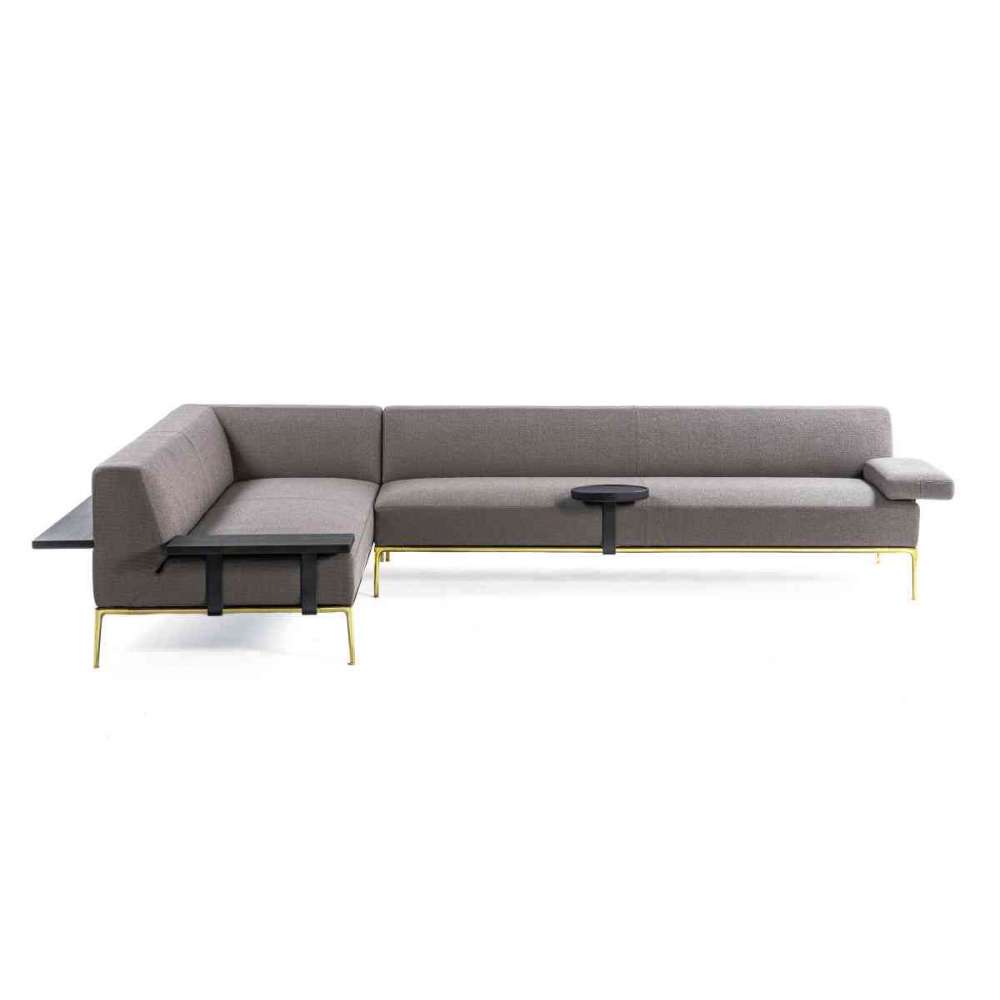 Kluczową cechą tej sofy jest możliwość opcjonalnego dołączenia stolika bocznego i podłokietnika. Włóż podłokietniki i części stołu w mosiężne nogi, aby je zamocować.