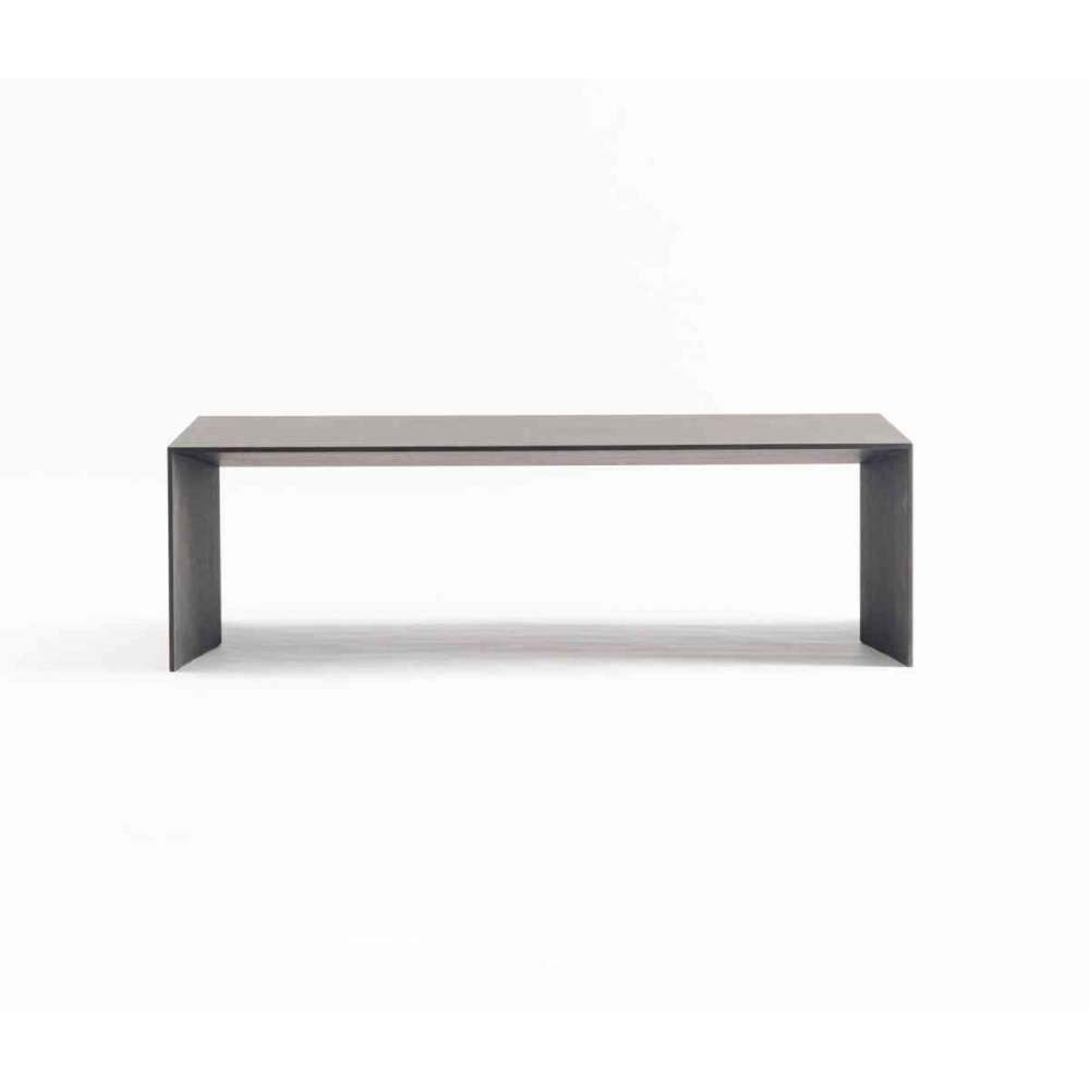 Metoda produkcyjna polegająca na mocowaniu drewnianych arkuszy forniru warstwowego lub arkuszy z wzorem drewna na aluminiowym panelu o strukturze plastra miodu w rdzeniu zapewnia cienkość i wytrzymałość drewnianych stołów. Jednakże, zgodnie z projektem architektonicznym Kengo Kumy, postawiliśmy sobie wyzwanie, aby maksymalnie odchudzić drewniany stół, aby uzyskać smukły, ostry wygląd przy użyciu wyłącznie drewnianych materiałów zamiast aluminiowego panelu o strukturze plastra miodu. Stworzyliśmy cienkie, delikatne krawędzie po obu stronach stołu, a zastosowanie grubej, nachylonej w kierunku środka górnej płyty dodało wytrzymałości. Bez użycia materiałów wzmacniających, takich jak środkowa noga i słupek, udało nam się stworzyć stół z długą górną płytą, a jednocześnie oferujący niespotykany dotąd efekt smukłości. Ten drewniany stół został zaprojektowany w dążeniu do maksymalnej lekkości poprzez zastosowanie dynamiki strukturalnej z architektonicznego punktu widzenia.