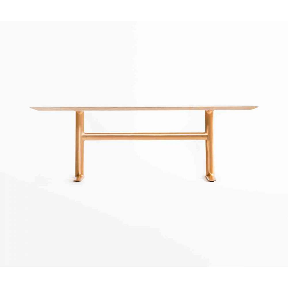 Most w poprzek stołu jest wykończony cienkim bezbarwnym lakierem, aby poprawić ekspresję brązu i zapewnić naturalne świeckie zmiany unikalne dla brązu są piękne. Pozostawia to miejsce na powolne zmiany w nadchodzących latach. Ponieważ połączenia łączące dwie nogi wymagają precyzji, w gotowej formie dokonuje się subtelnych korekt poprzez obróbkę skrawaniem. Rzemieślnicy w fabryce zwracają uwagę na szczegóły, aby połączenia były jednolite i pozbawione wad. Ciężar właściwy brązu jest cięższy w porównaniu z innymi metalami do mebli. Z tego powodu głównym atutem jest jego stabilność w porównaniu z innymi metalami, nawet w małych rozmiarach. Na przykład, gdy ciężar właściwy aluminium wynosi 2,7, ciężar właściwy brązu wynosi 8,9, czyli jest około trzy razy cięższy. W porównaniu ze stalą o ciężarze właściwym 7,8, brąz oferuje najwyższą stabilność w porównaniu z innymi metalami do mebli. Korzystając z właściwości brązu, oferujemy linię długich stołów o szerokości do 3200 mm dla blatu. Dużej, długiej, ciężkiej, litej deski nie da się podeprzeć małymi nóżkami, dlatego używamy nóg z brązu o większym ciężarze właściwym. Ponadto brąz z czasem wykazuje zielonkawą, niebieskawą rdzę, jak moneta o nominale 10 jenów. Miedziana rdza materiałów tworzy gustowny wyraz podobny do dzwonów i buddyjskich posągów w świątyni. Ta rdza z pewnością odzwierciedla poczucie estetyki Japonii. Powierzchnia brązu jest wypalana w wysokiej temperaturze po nałożeniu pędzla na japoński lakier, aby dodać głębi lakierowi i połysku brązowemu kolorowi, tworząc piękne wykończenie.