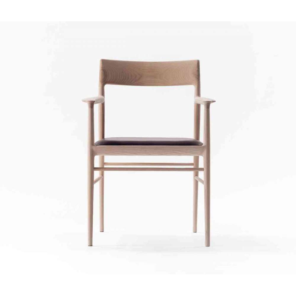 Krągłości, których nieświadomie chcesz dotknąć, oraz złożone połączenia są precyzyjnie wyrzeźbione z naturalnego drewna i wypolerowane przez rzemieślników, aby uzyskać wspaniałe wykończenie. Lekko wygięty, aby zapewnić podparcie pleców, ramiak krzesła płynnie łączy się z oparciem, a nogi mają prostą, ortodoksyjną konstrukcję z przebijającymi się belkami stropowymi. Oparcie zostało wyrzeźbione z giętego drewna, aby podkreślić wyraz drewna. Aby naturalna faktura drewna nie sprawiała wrażenia ciężkości, oparcie, rama siedziska i podłokietniki mają ostrą formę, która emanuje poczuciem lekkości, celem co ma na celu stworzenie standardowego wyglądu pasującego do każdego zastosowania. Wykończenie mydłem tworzy delikatne wrażenie, które dodaje fakturze drewna, podczas gdy wykończenie farbą tworzy jeszcze ostrzejsze, jaśniejsze wrażenie. Prosta jak strzała forma krzesła i faktura drewna jednocześnie nadają przestrzeniom lekkości i miękkości.