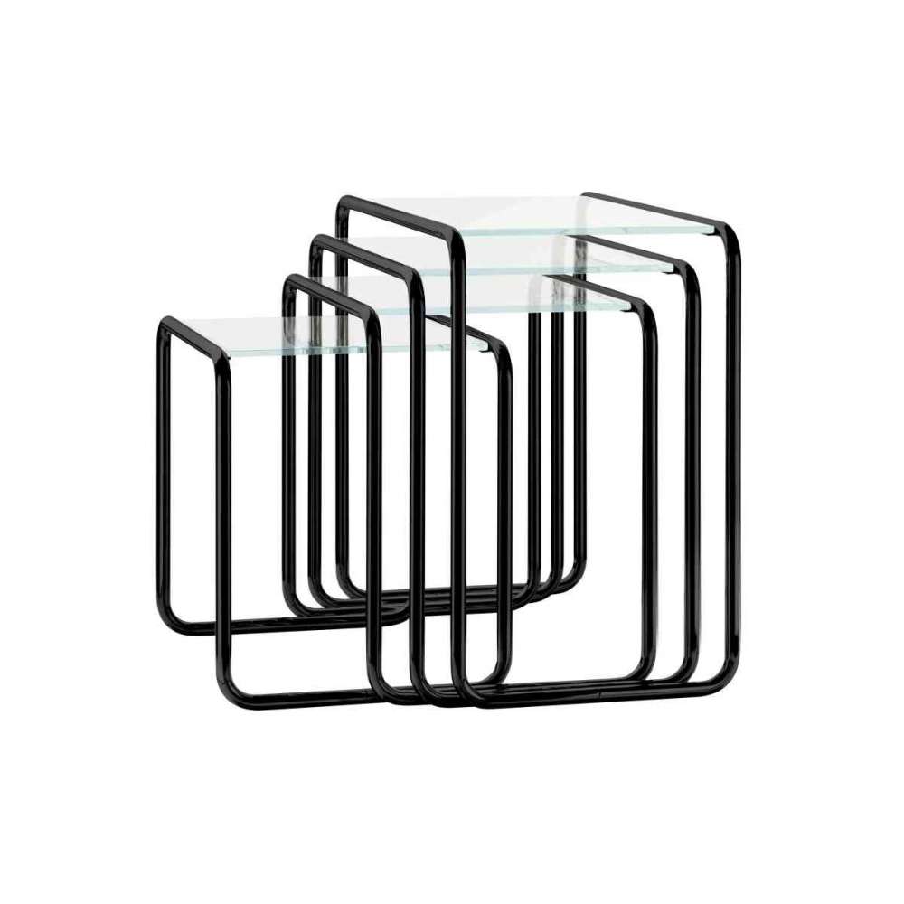 Nowe szklane wersje programów mebli bocznych z rur stalowych B 9 i B 97 – podobnie jak nowa linia „Klasyka w kolorze” – odzwierciedlają trend zmian i dalszy rozwój wybranych klasyków Thoneta. Szklana powierzchnia podkreśla przejrzystą, lekką konstrukcję rurowych stalowych ram, na których blat wydaje się być osadzony. Prosty i funkcjonalny program B 9, składający się ze stolików bocznych i hokerów o różnej wysokości, to projekt instruktora Bauhausu Marcela Breuera. Zestaw stołowy B 97 bez tylnych nóg to autorski projekt.