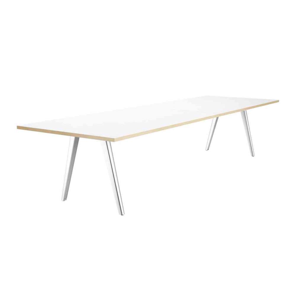 Nogi stołu aluminiowe polerowane, chromowane lub malowane proszkowo na kolor czarny lub biały lub z litego dębu. Blaty dostępne w wersji okleinowanej lub z płyty HPL.