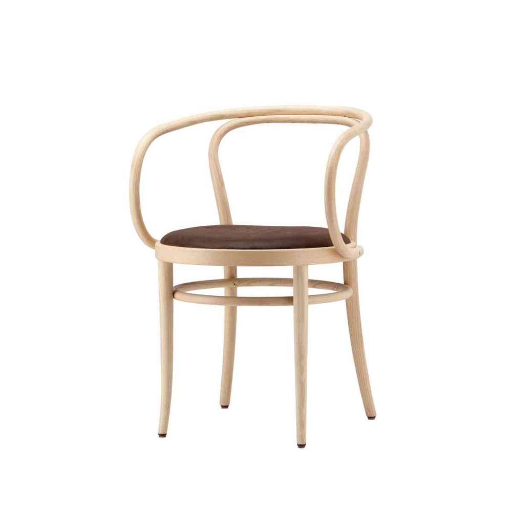 Ten elegancki klasyk z giętego drewna jest arcydziełem w swojej konstrukcji i produkcji: wystająca rama, która tworzy zarówno oparcie, jak i podłokietniki, jest wygięta w swoją formę z jednego kawałka litego drewna bukowego. oryginalny model wszystkich krzeseł z drewna giętego nr 214, krzesło nr 209 również składa się tylko z sześciu części.Dzięki estetycznej redukcji w połączeniu z organiczną formą wygląda niemalże jak rzeźba.Zafascynował się nią szwajcarski architekt Le Corbusier i użył go w wielu swoich budynkach, na przykład w osiedlu Weissenhof w Stuttgarcie w 1927 roku. Potwierdził, że „…to krzesło ma szlachetność”. oparcie Siedzisko i oparcie obszyte trzciną * lub pokryte skórą lub tkaniną Siedzisko dostępne również jako siedzisko z profilowanej sklejki Wszystkie elementy drewniane w kolorze buk bejcowany