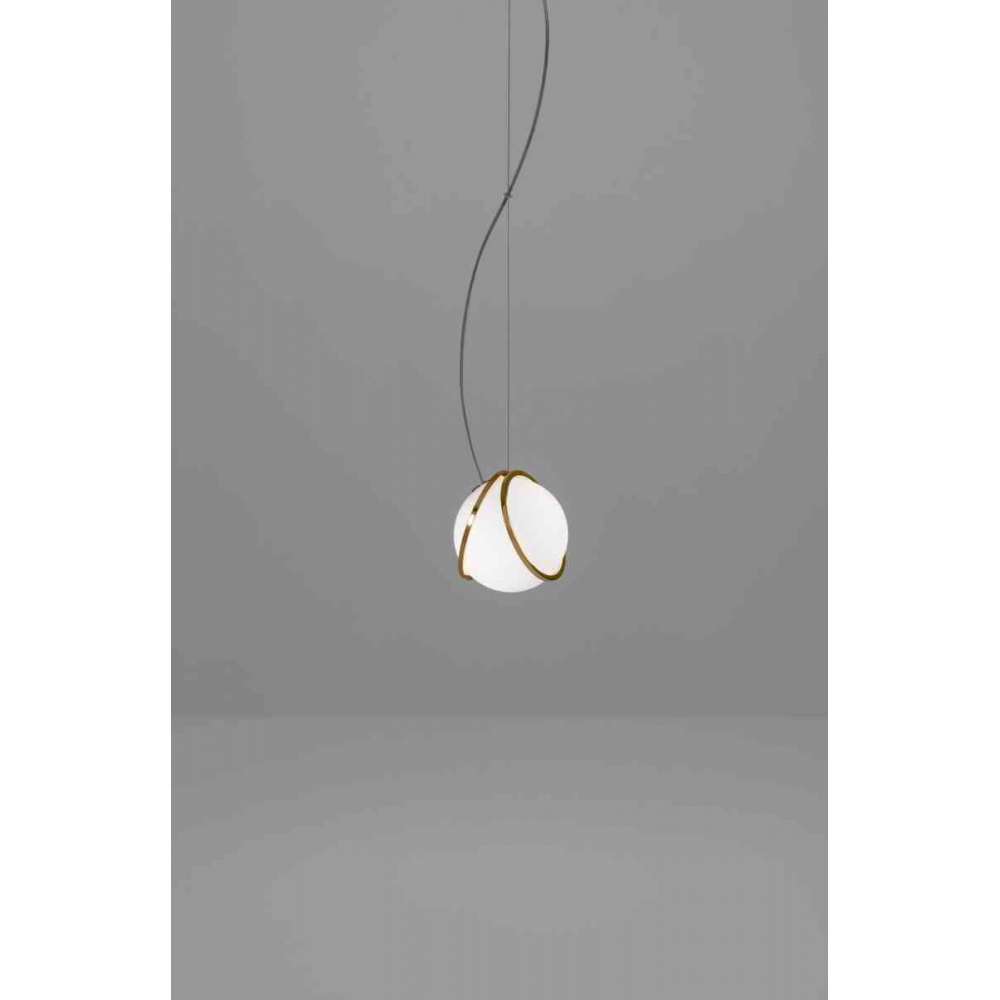 Te szklane wisiorki, oświetlone światłem LED, są otoczone dwoma mosiężnymi paskami. Dostępny w dwóch wariantach: szkło i mosiądz lub satynowe szkło i polerowany mosiądz.