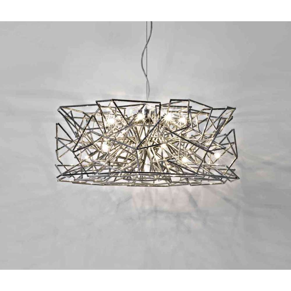 Niebiańskie zawieszenie splecionych niklowanych metalowych prętów, Etoile migocze we wszystkich kierunkach, tworząc delikatną grę światła i cienia dla każdej przestrzeni. Zaprojektuj Christian Lava.