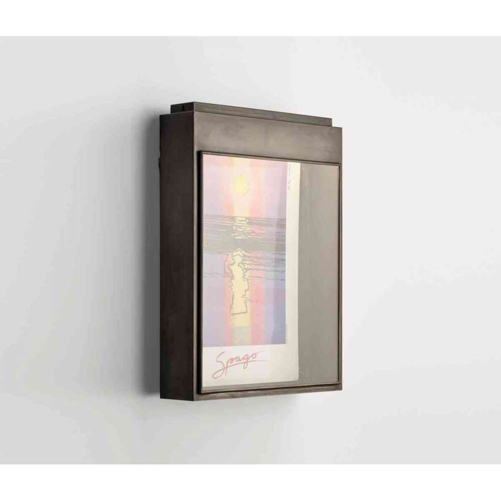 Mosiężna lampa ścienna z przezroczystym szkłem. Nadaje się do pionowego menu A4. Zamknięta górna część stanowi jednocześnie podstawę dla osprzętu elektrycznego oraz oświetlenia pośredniego.
