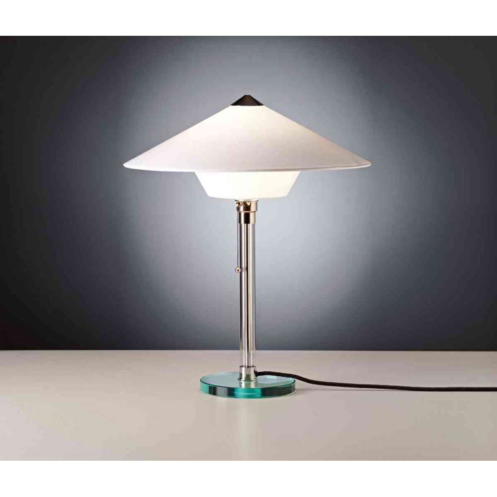 Pracując w Wyższej Szkole Inżynierii Budowlanej w Weimarze, w 1930 roku, Wilhelm Wagenfeld stworzył te lampy stojące i stołowe z abażurami z tkaniny. Optyczna bliskość lamp stołowych Bauhaus świadczy o ciągłej chęci Wagenfelda do eksperymentowania i nieustannych poszukiwaniach ostatecznej formy, którą często udaje się znaleźć przed faktycznym zakończeniem rozwoju. Oryginalnie lampy były produkowane z abażurami Cellon. Jednak ten materiał nie jest już dozwolony ze względów bezpieczeństwa, dlatego produkujemy nasze modele z żaroodpornym kloszem z tworzywa sztucznego pokrytym tkaniną.
