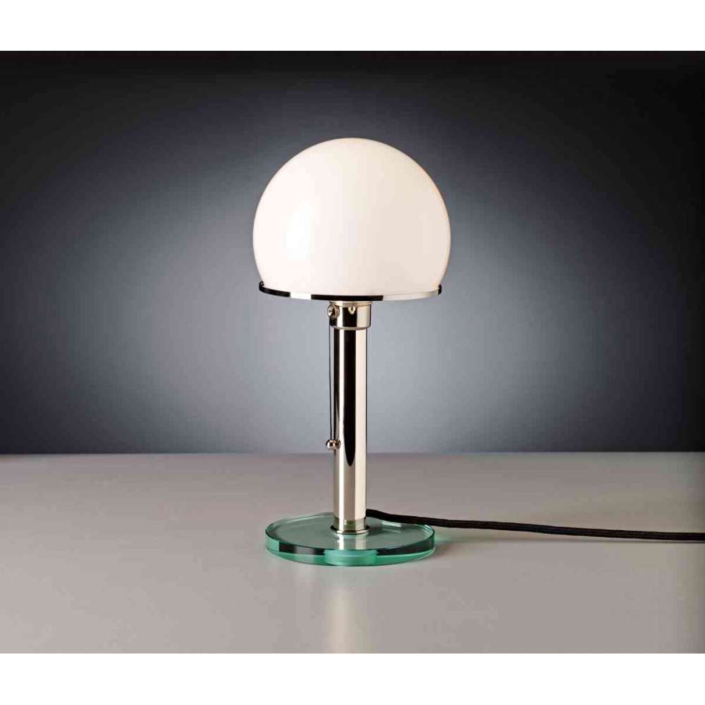 Inny wariant lampy Wagenfeld Bauhaus: Lampa z niklowaną rurą i szklaną podstawą. Gniazdo: E 27, maks. 75 W