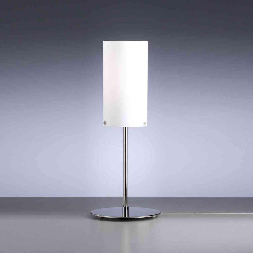 Info: Lampa stołowa z cylindrycznym szkłem i niklowaną podstawą