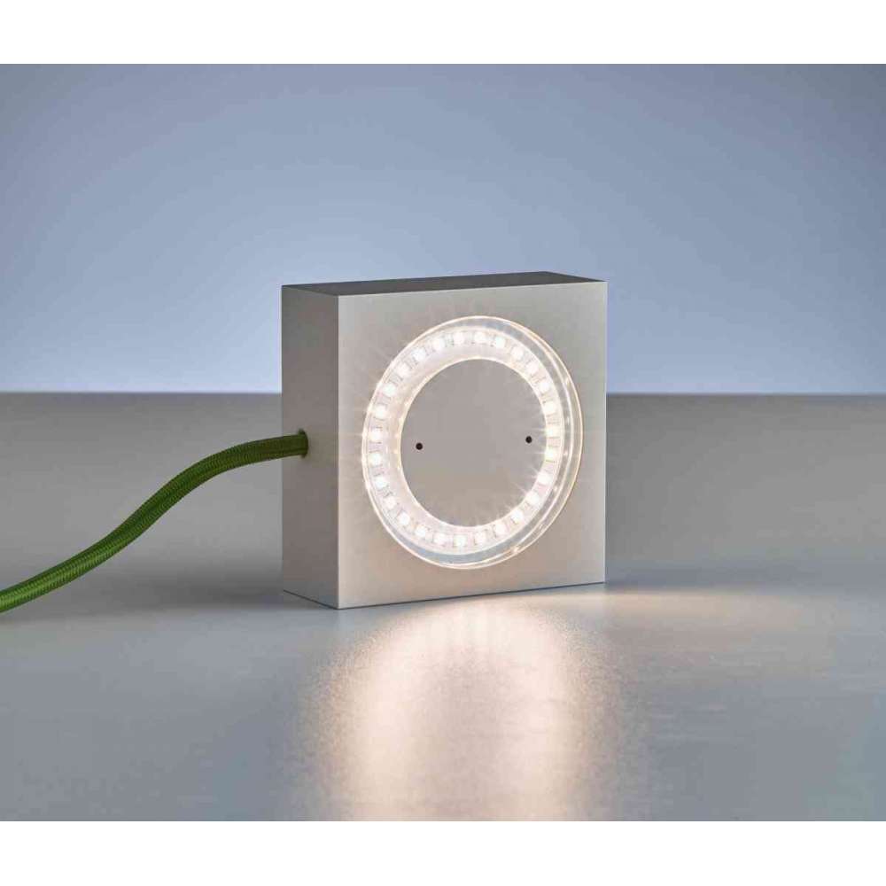 Mehrzweckleuchte aus eloxiertem Aluminium mit integrierter LED in Warmweiß und farbigem Netzkabel. Als Zubehör ist ein Standfuß aus Buchenholz (natur oder schwarz gebeizt) verfügbar.