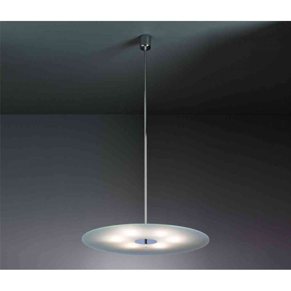 Lampa wisząca firmy Hans Przyrembel Ta prosta lampa wisząca składa się z grubej płyty z matowego szkła utrzymywanej centralnie za pomocą chromowanego pręta. Oprawa ta daje ogólne źródło światła w pomieszczeniach z wysokimi sufitami. Lampa została zaprojektowana w 1928 roku w dwóch różnych rozmiarach (średnica 500 lub 700 mm). 4/6 x 60 W