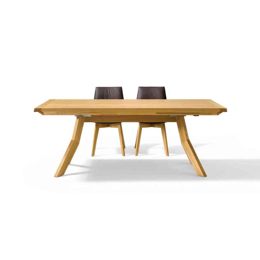 Nasz rozkładany stół yps przyciąga wzrok tym samym językiem projektowania, co stół nierozkładany yps: kanciasty, purystyczny, wykonany w całości z prawdziwego, mocnego, litego drewna. Ten wygląd jest szczególnie wyraźny, gdy stół jest zwarty. Nawet w rozszerzonej formie ujawnia się doskonały, płynny projekt aż do najdrobniejszych szczegółów. yps można wyposażyć w jeden lub dwa wkłady stołowe o długości 60 cm. Dzięki temu możesz w mgnieniu oka stworzyć miejsce na maksymalnie cztery dodatkowe siedzenia. Alternatywnie możliwe jest połączenie wkładu na stół i szuflady na sztućce lub jednej lub dwóch szuflad na sztućce. stół nierozkładany, ze ściętymi krawędziami i charakterystycznym paskiem z przodu, również ze stołem rozkładanym. Idealne proporcje zostają zachowane nawet po rozciągnięciu. Dodatkowo niska wysokość technologii rozkładania zapewnia podobnie dużą przestrzeń na nogi jak w przypadku stołu nierozkładanego.