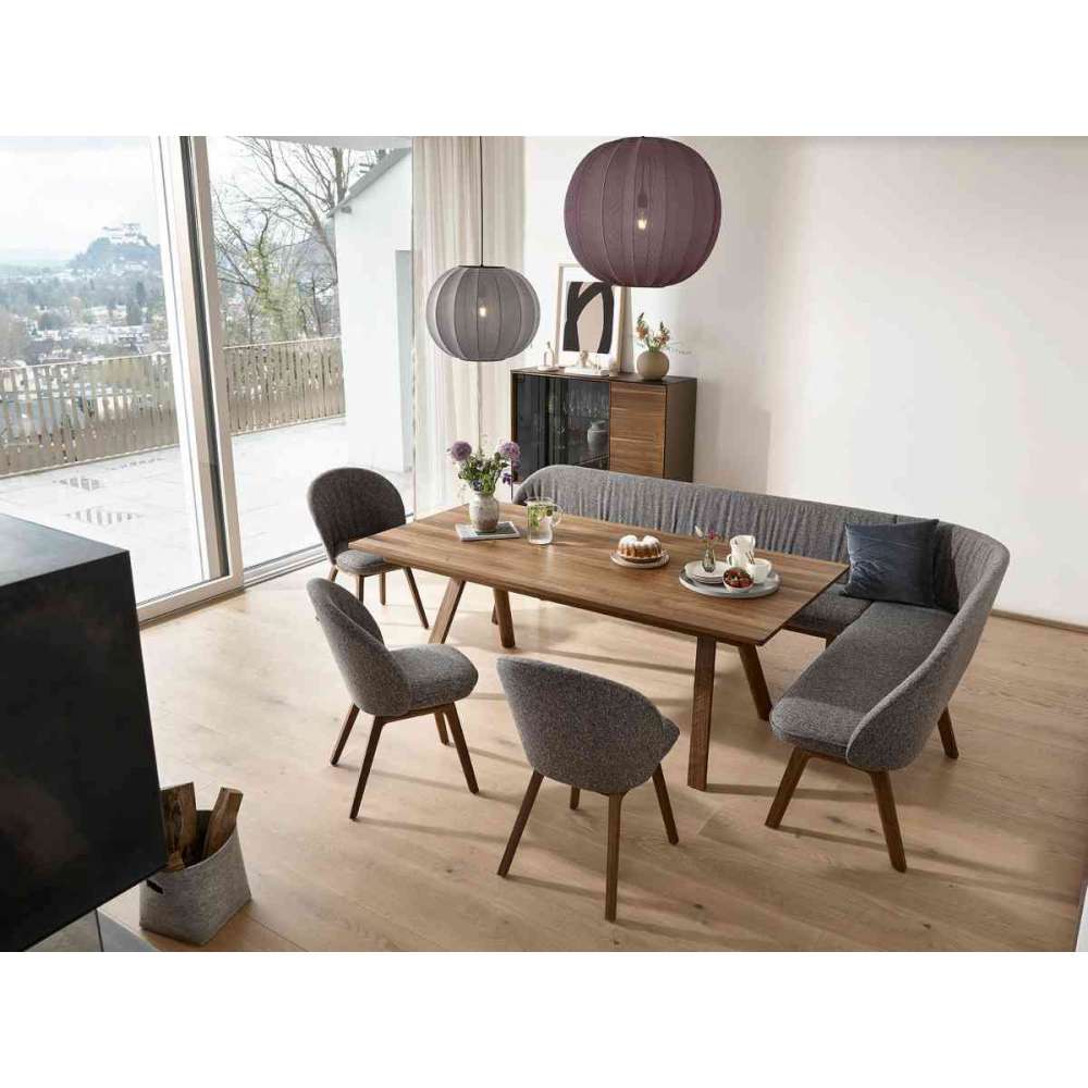 Czysty, lekki i przejrzysty w formie: tak prezentuje się nasz stół taso wykonany w całości z litego drewna. Wykonany w ultranowoczesnej technologii trójwarstwowej blat zachwyca delikatnym wyglądem. Profile wysuwne, wykonane w całości z litego drewna, są rozmieszczone w taki sposób, że nawet po wyciągnięciu zachowują wysokiej jakości wygląd bez możliwości zobaczenia lub wyczucia profili. Zaokrąglone rogi i zaokrąglone dolne krawędzie sprawiają, że lite drewno wydaje się miękkie. Wcięte nogi z litego drewna w kształcie litery A zapewniają maksymalną przestrzeń na nogi i dużo miejsca na krzesła z podłokietnikami. Blat, profile przedłużające i nogi – 100% prawdziwe lite drewno.