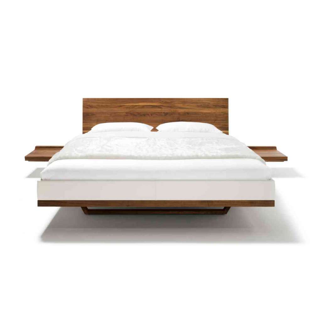 Wpuszczone prowadnice sprawiają, że łóżko Riletto wydaje się unosić. Zagłówek i boki łóżka są opcjonalnie dostępne z prawdziwego naturalnego drewna lub ze skóry.